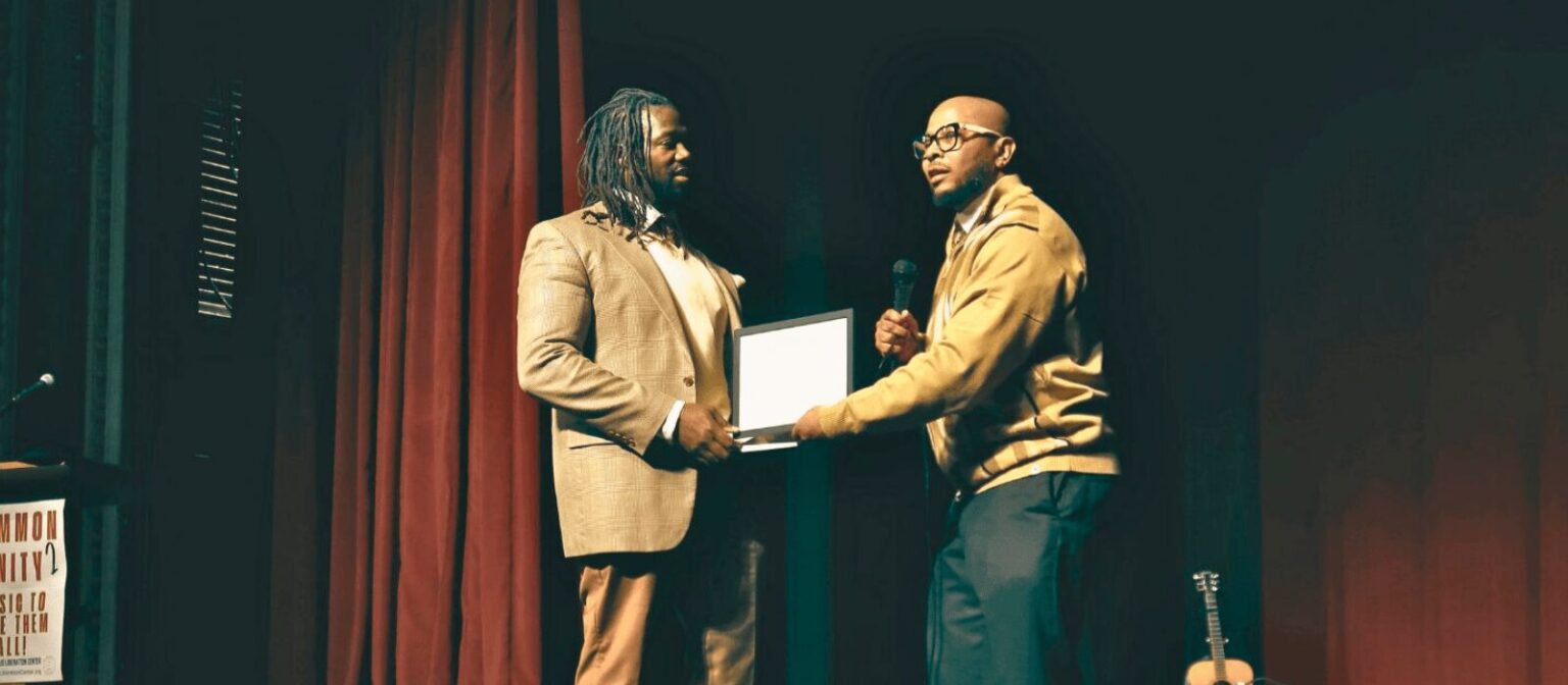 Image: Leon Benson presents Vernon T. Bateman with an award at the Common Unity 2.0 Concert. Credit: Indianapolis Liberation Center.